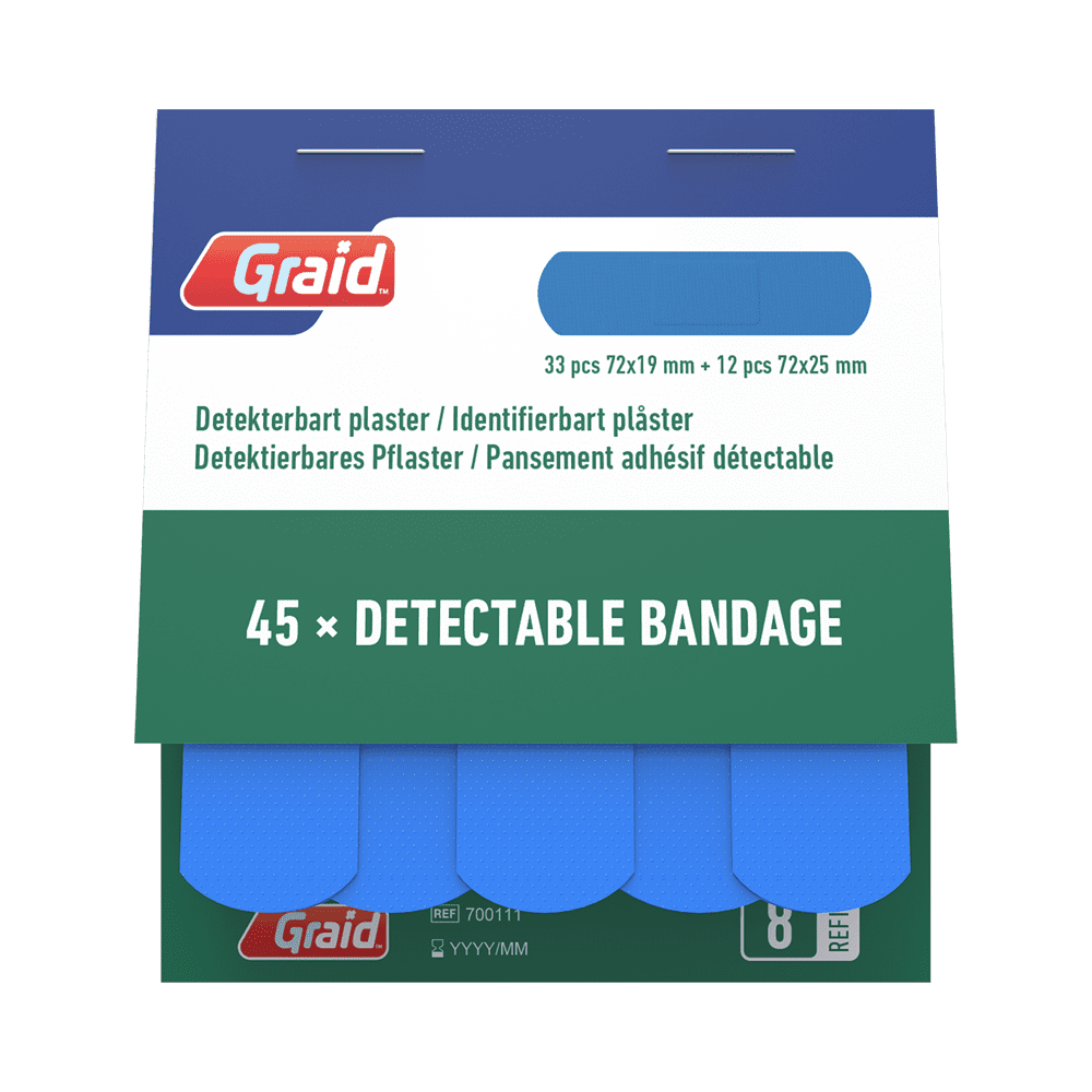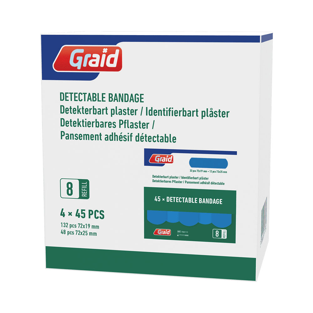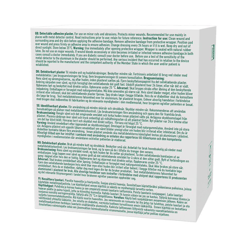 Detectable adhesive plaster. For use on minor cuts and abrasions. Protects minor wounds. Recommended for use mainly in places with metal detector control. Easy fix feature.