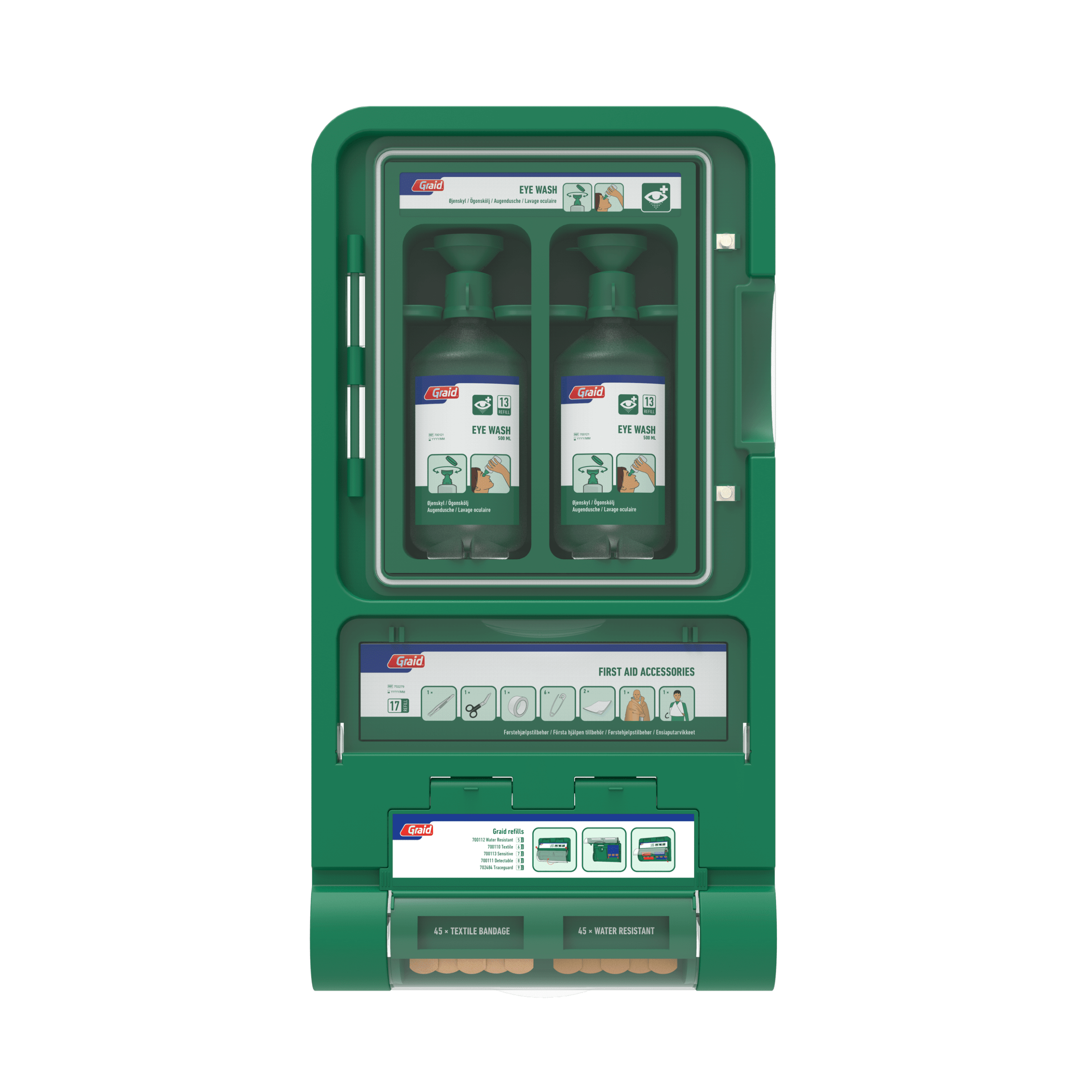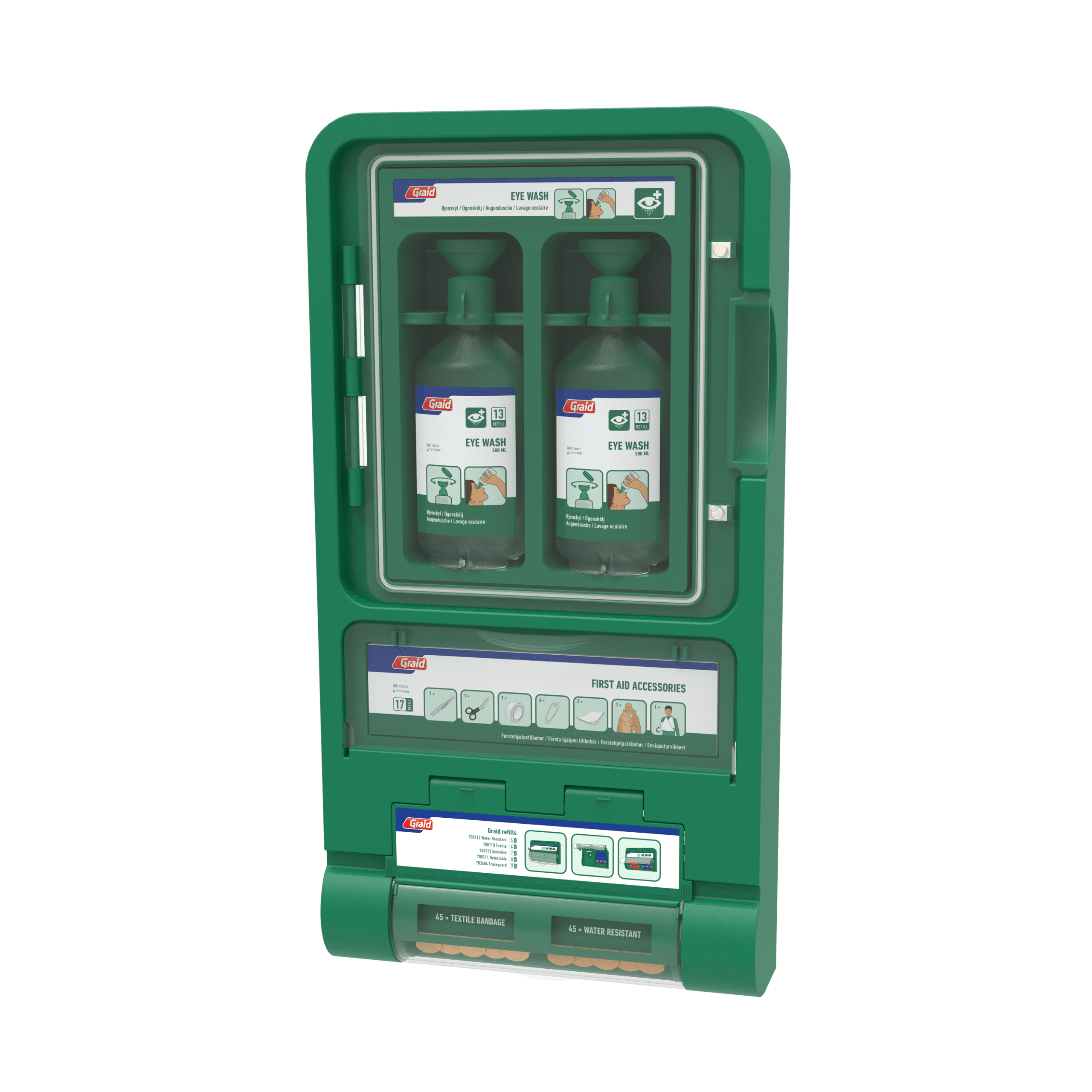 Fully equipped eye wash station with easy fix plasters and first aid accessories.