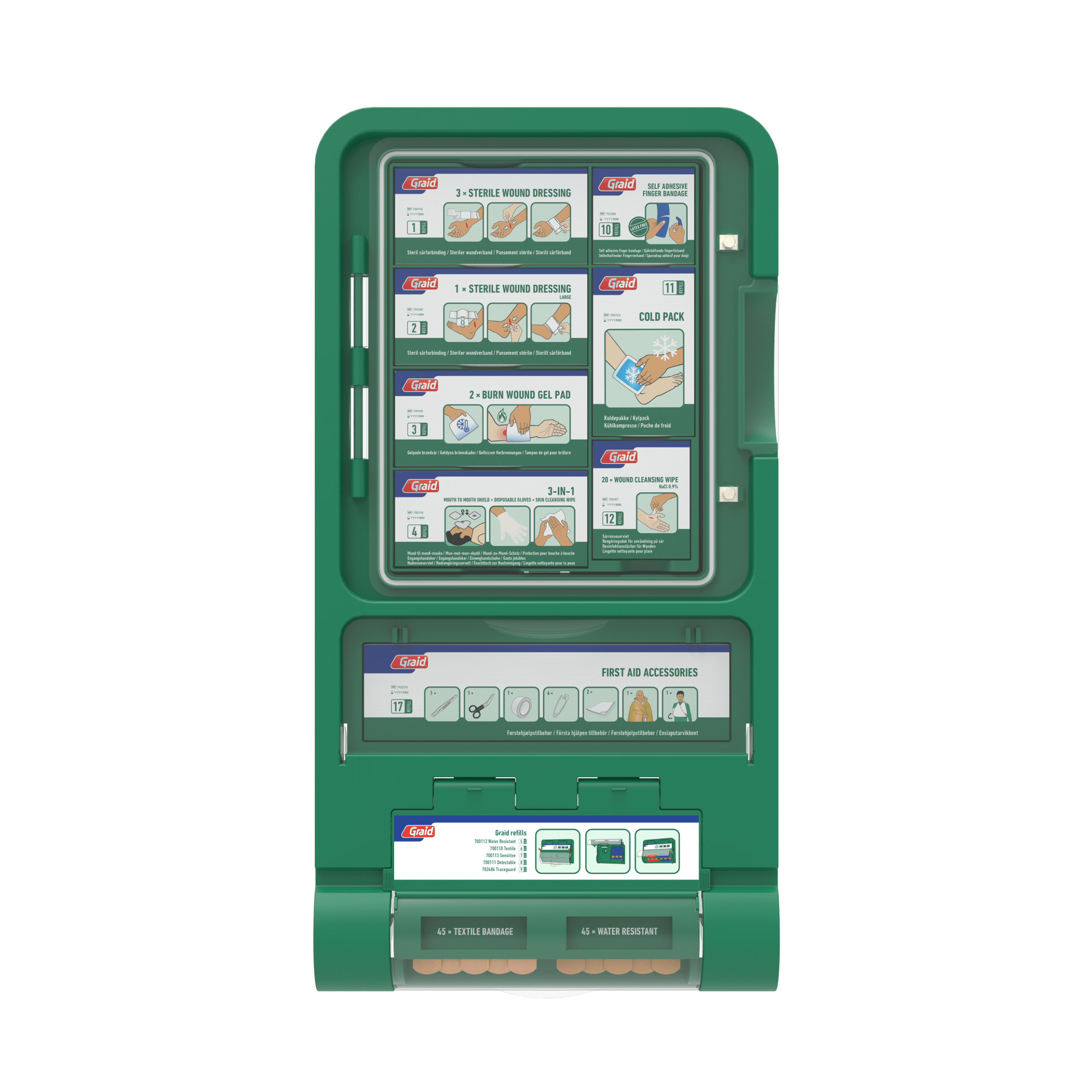 Fully equipped first aid station with easy fix plasters and first aid accessories.